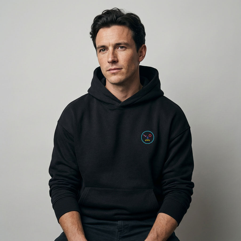 A pullover hoodie crafted from a fine, soft and sturdy blend of cotton and recycled polyester. It features a relaxed silhouette with dropped shoulders, a kangaroo pocket, self fabric lined darted hood without drawcords, featuring an urban, elevated look. High quality cuffs and bottom hem in 1x1 rib.